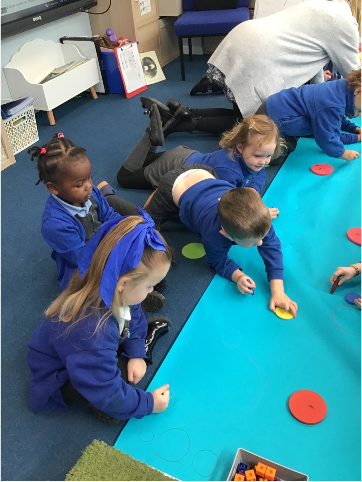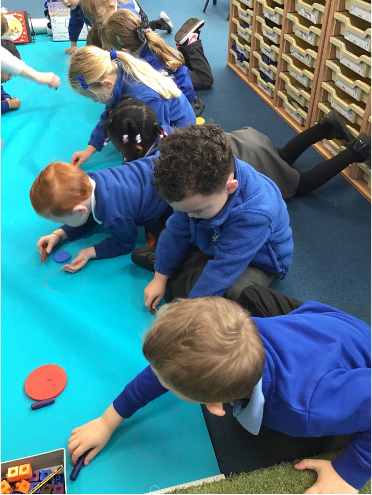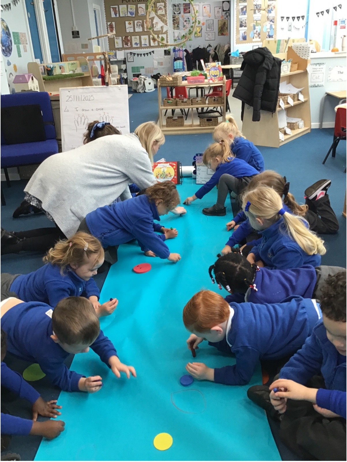In Nursery Maths, the children have been learning about the 2D shape - circles. After lots of conversation, describing the shape, spotting it among others, and noticing circles in the environment, the children had a go at drawing them. We linked our learning to physical development by practising both gross and fine motor skills, drawing circles on large paper together.